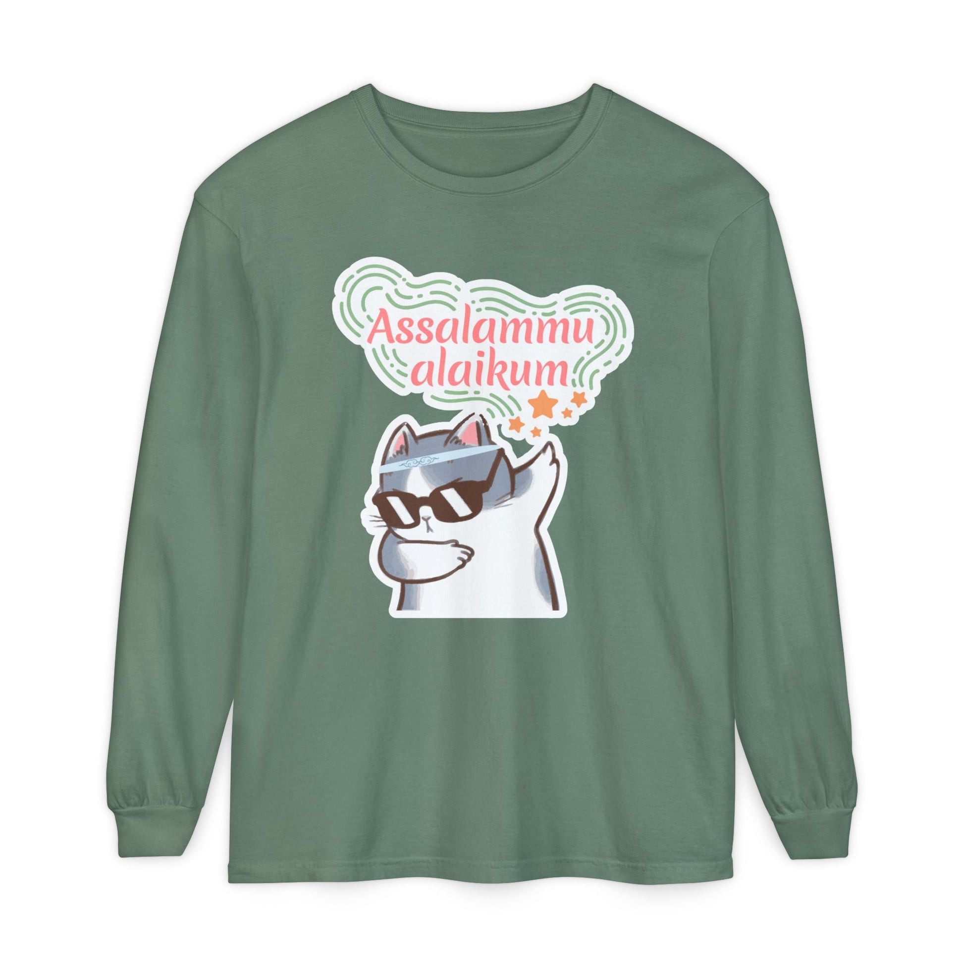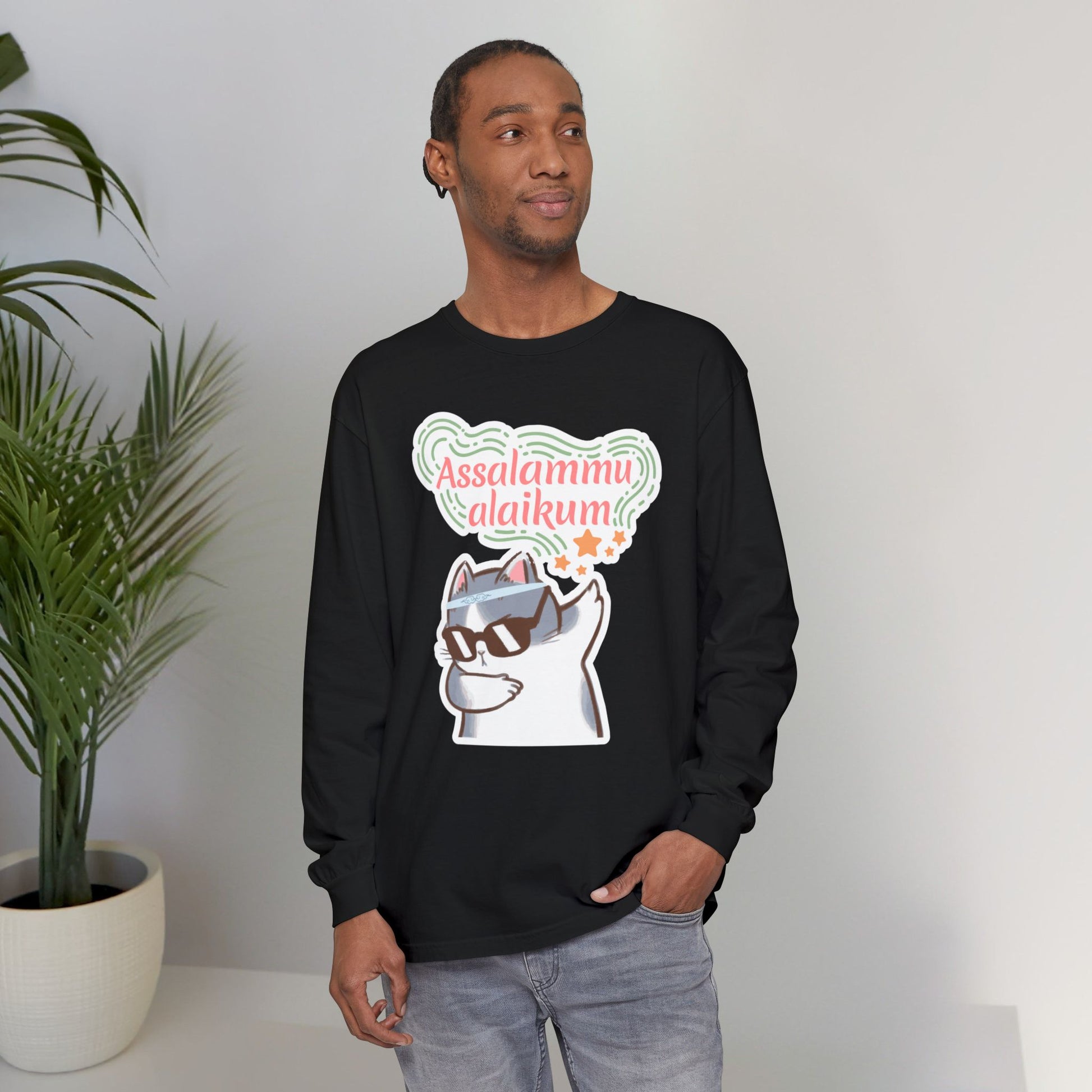 Assalamualaikum Typographic Long Sleeve Tee T-Shirt - Cat Sunglasses Graphic Cozy Soft Cotton Unisex Long Sleeve Tee