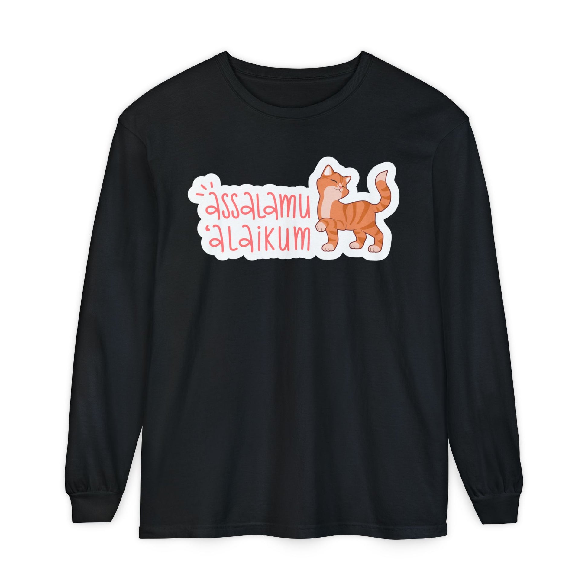 Assalamualaikum Typographic Long Sleeve Tee T-Shirt - Cute Cat Smug Graphic Cozy Soft Cotton Unisex Long Sleeve Tee