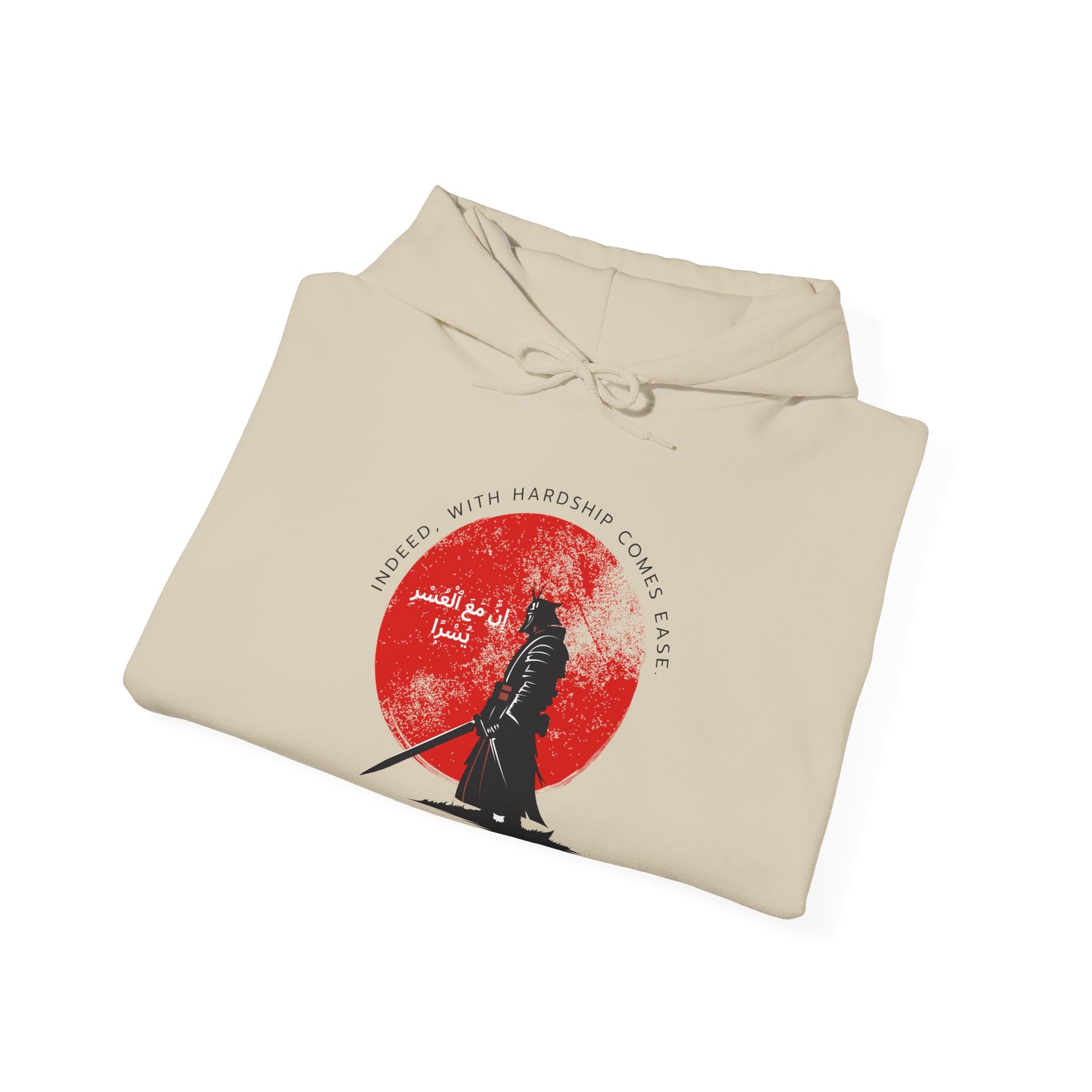 Spread positivity and faith with our Indeed with Hardship Comes Ease Typographic Hoodie - Cozy Soft Cotton Unisex Samurai Statement Hoodie! A cozy and stylish pullover designed to remind us about muslim way of life. In Islam, the phrase "Indeed, with hardship [will be] ease" (Quran 94:5-6, Surah Ash-Sharh) is a divine promise that every difficulty is accompanied by relief, meaning ease isn't just after hardship but with it, offering inner strength, patience, and new perspectives during trials, reinforcing faith in Allah's mercy and plan, and encouraging steadfastness.