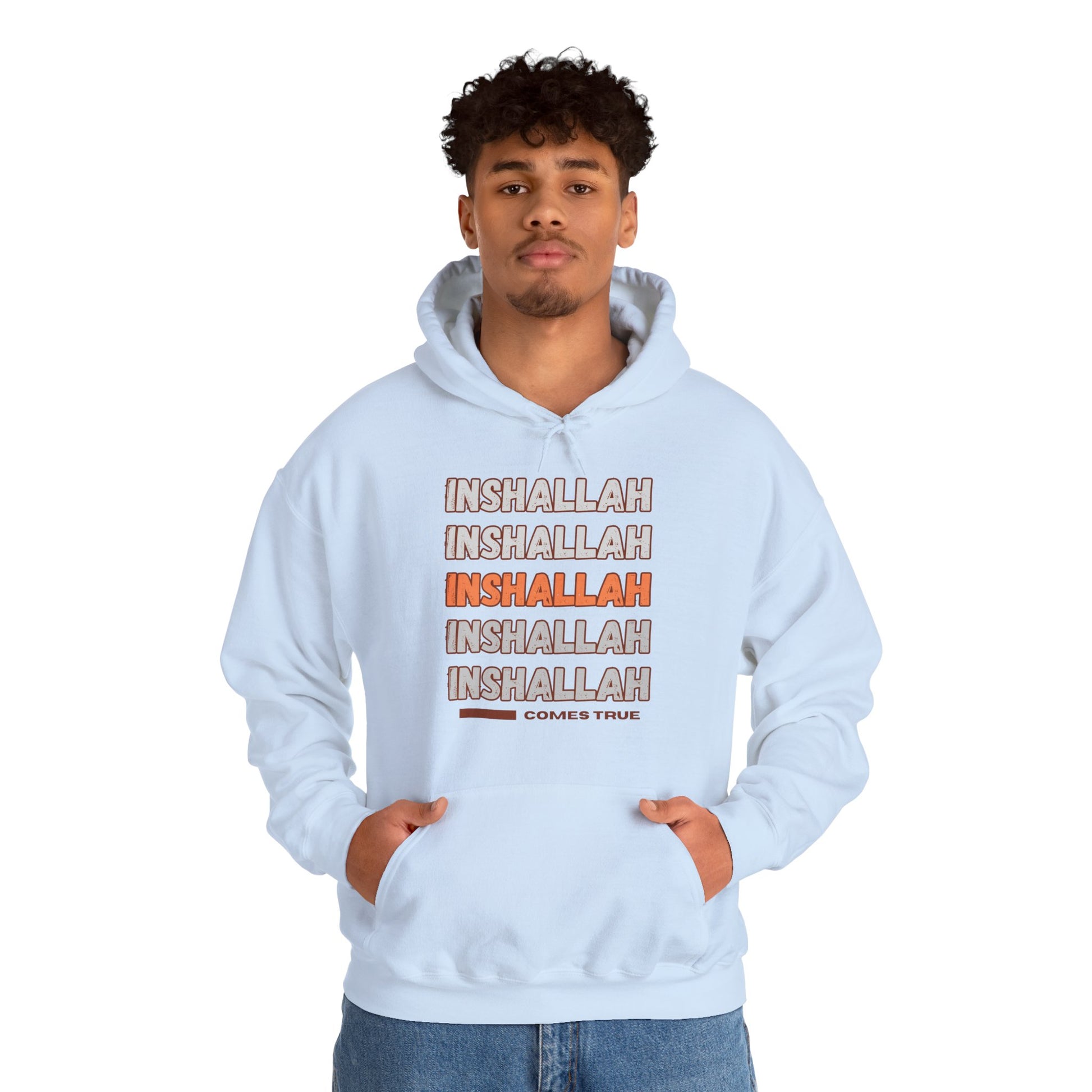 Spread positivity and faith with our Inshallah Comes True Typographic Hoodie - Cozy Soft Cotton Unisex Hoodie! A cozy and stylish pullover designed to remind us of the the might of Allah. "Inshallah" is an Arabic phrase meaning "if God wills" or "God willing" that is central to Islam. It is used when referring to future events as a way to acknowledge that the outcome is ultimately in God's hands. The phrase is a reminder of submission to God's will, a concept rooted in the Quran, and is expressed with humility and faith in everyday conversation.