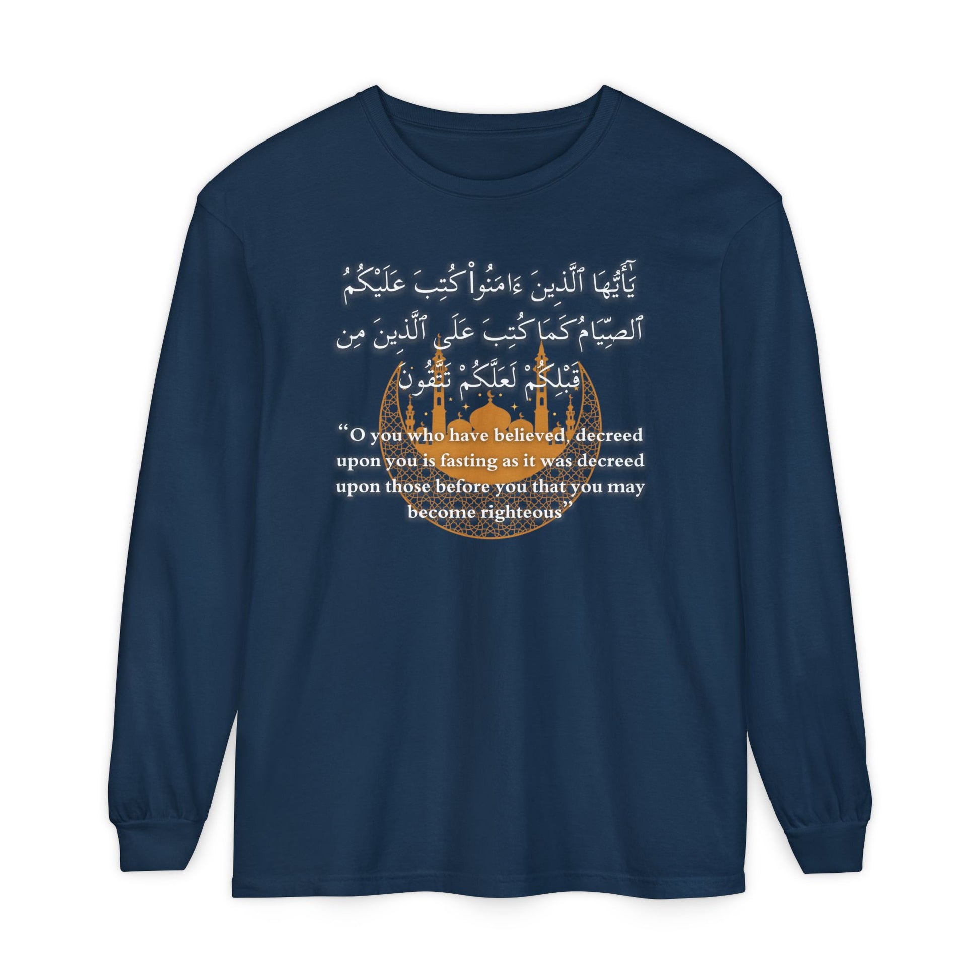 Spread positivity and faith with our يَٰٓأَيُّهَا ٱلَّذِينَ ءَامَنُوا۟ كُتِبَ عَلَيْكُمُ ٱلصِّيَامُ كَمَا كُتِبَ عَلَى ٱلَّذِينَ مِن قَبْلِكُمْ لَعَلَّكُمْ تَتَّقُونَ Islamic Ramadan Fasting Long-Sleeve T-Shirt - Arabic Calligraphy Islamic Unisex Long-Sleeve Tee.