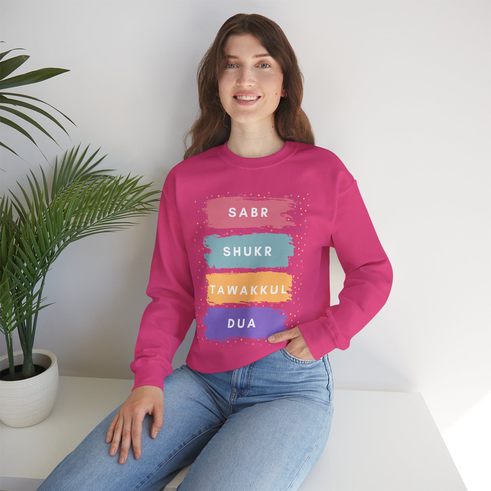 Spread positivity and faith with our Sabr Shukr Tawakkul Dua Typographic Sweatshirt - Colorful Cozy Soft Cotton Unisex Sweatshirt! A cozy and stylish pullover designed to remind us of Sabr Shukr Tawakkul Dua. In Islam, Sabr (Patience), Shukr (Gratitude), Tawakkul (Trust in Allah), and Dua (Supplication) are core spiritual concepts representing pillars of faith, guiding Muslims to remain steadfast in hardship (Sabr), thank God for blessings (Shukr), rely fully on His plan (Tawakkul), and maintain a direct connection with Him through prayer (Dua). These principles form a comprehensive approach to life, strengthening one's relationship with Allah through endurance, thankfulness, reliance, and prayer.