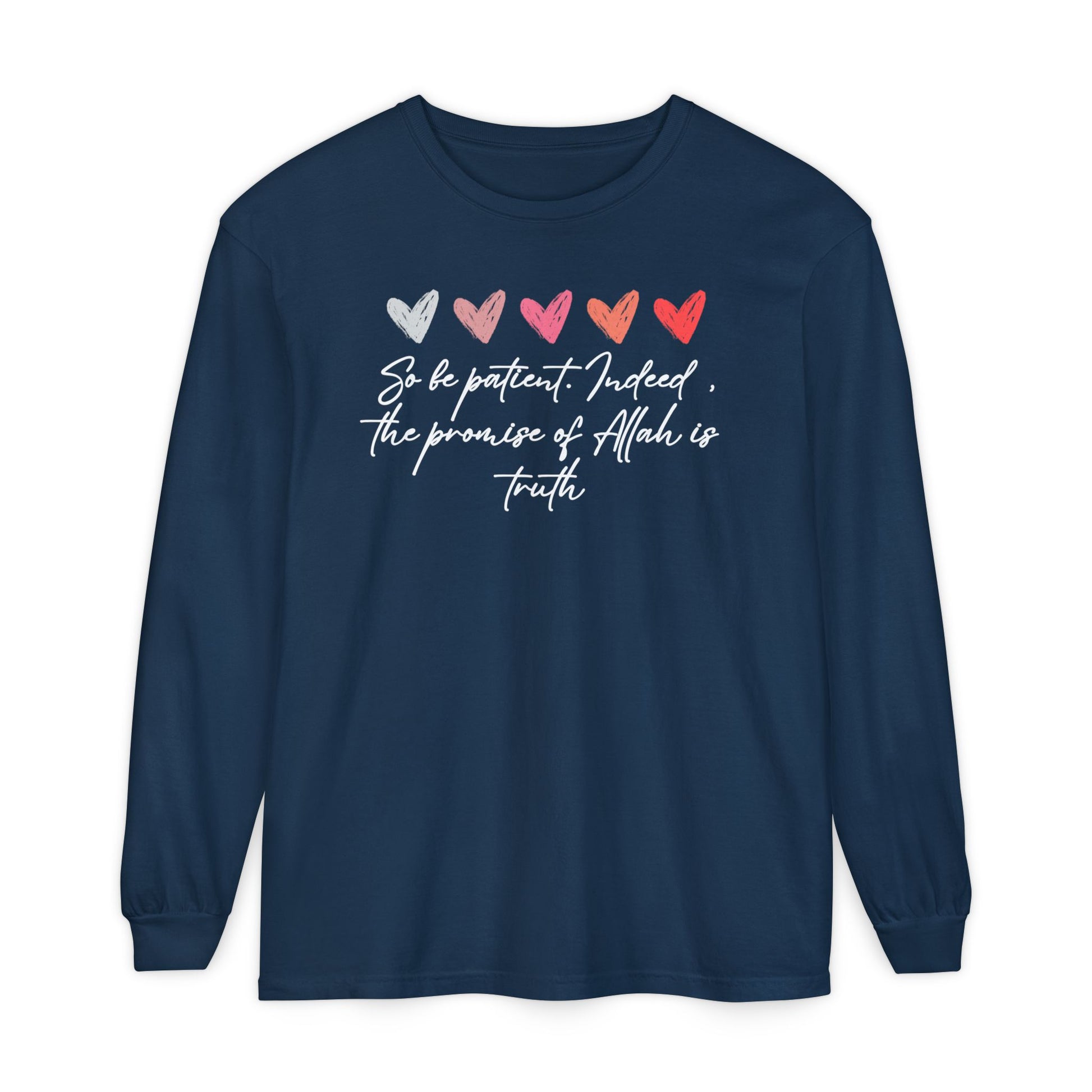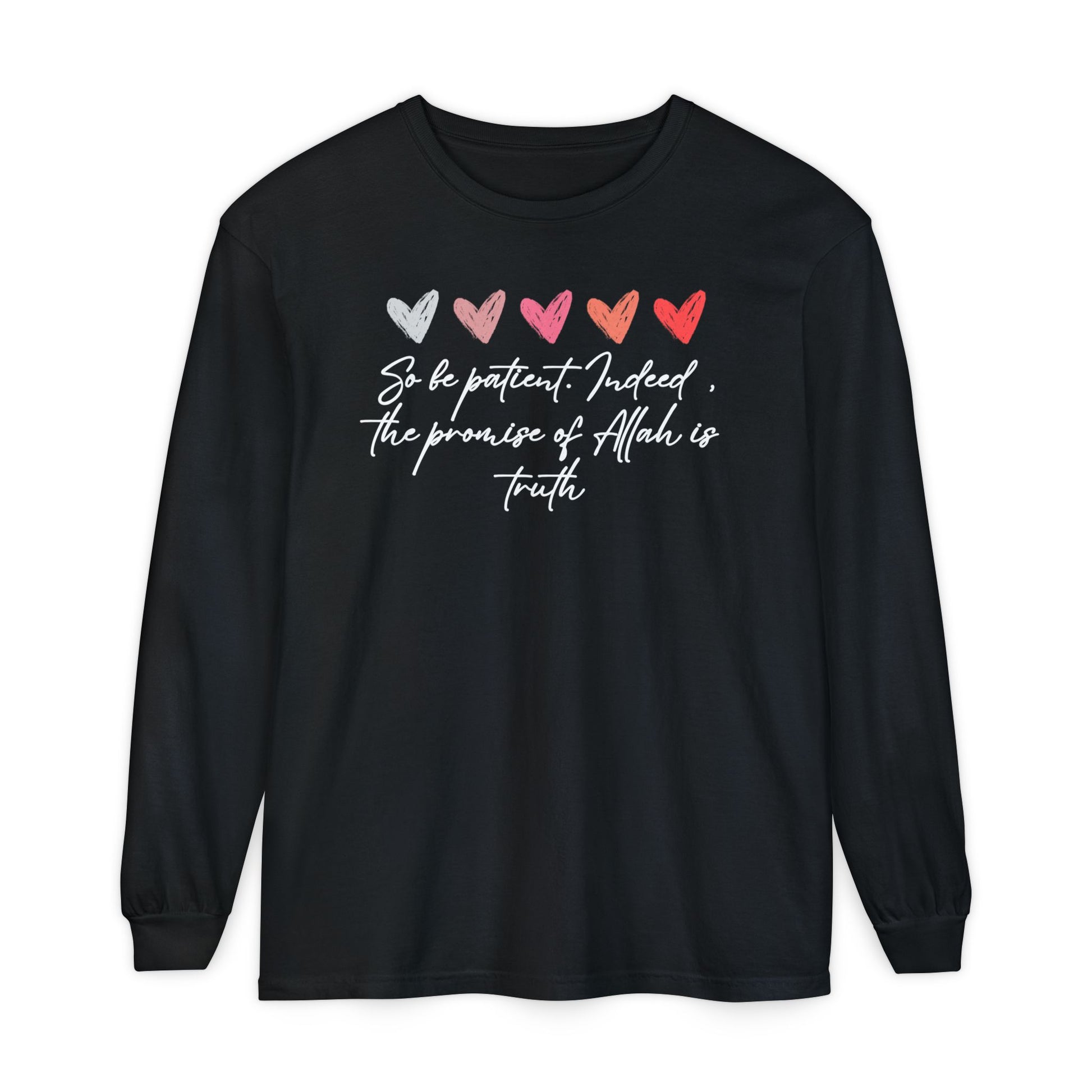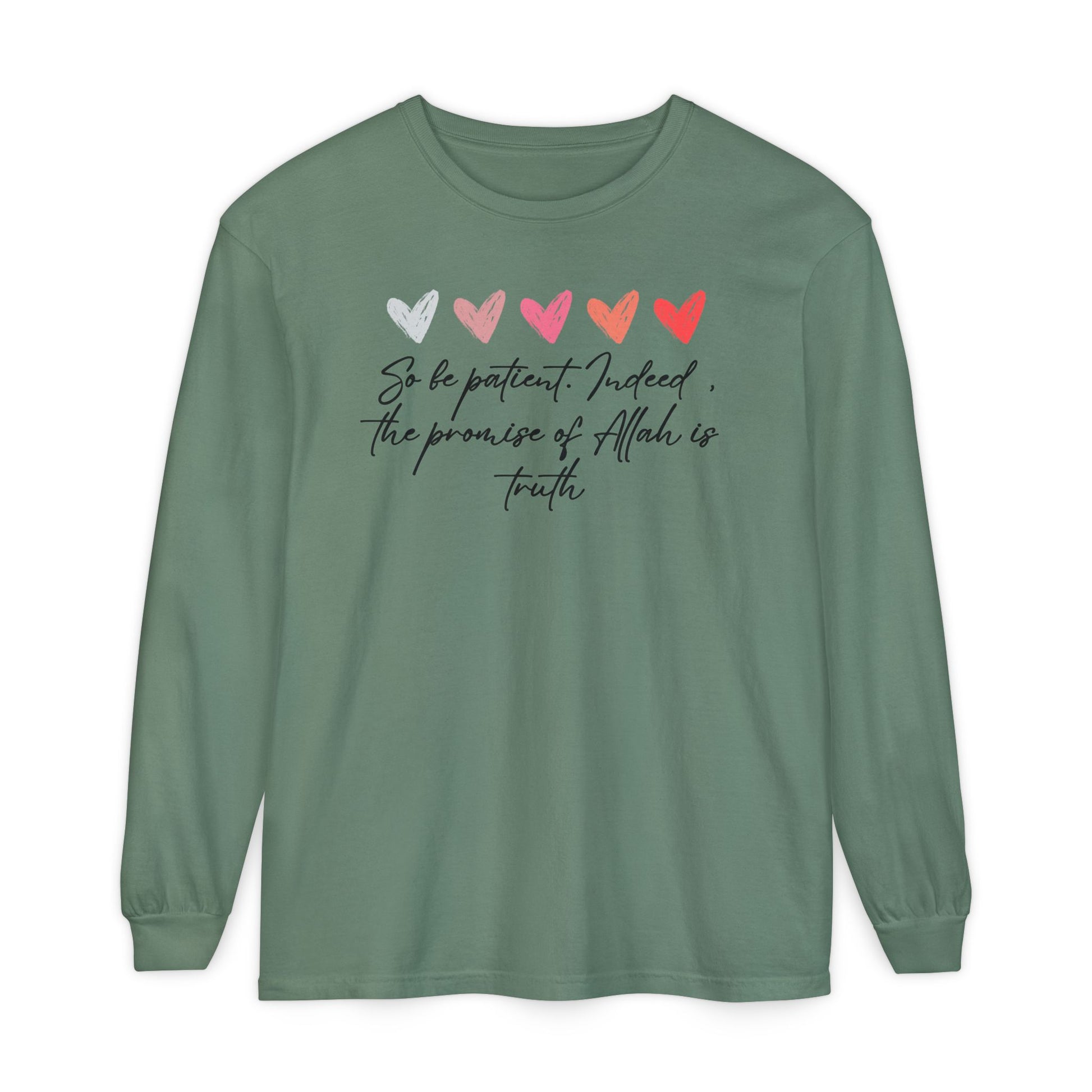 So be Patient. Indeed, the Promise of Allah is Truth Al Quranic Typographic Long-Sleeve Tee T-Shirt - Cozy Soft Cotton Unisex Long-Sleeve Tee