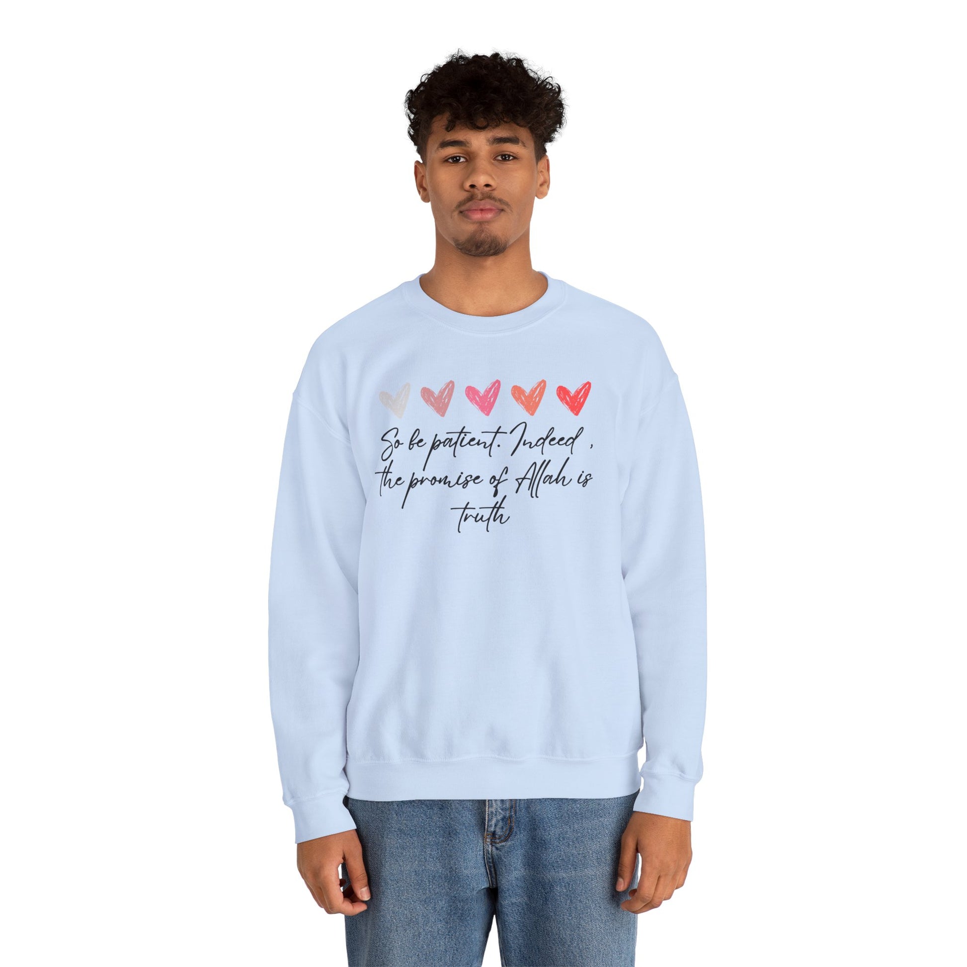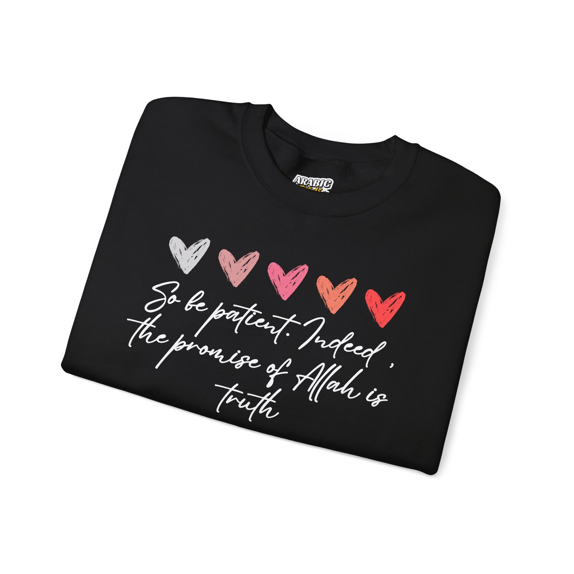 So be Patient. Indeed, the Promise of Allah is Truth Al Quranic Typographic Sweatshirt - Cozy Soft Cotton Unisex Sweatshirt