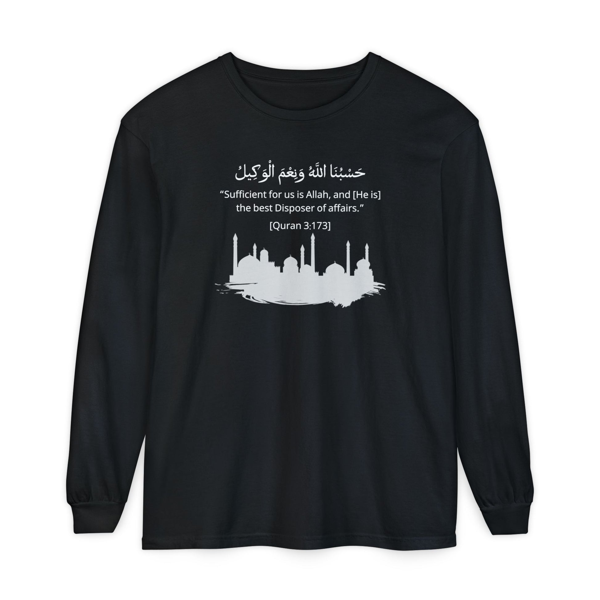 Find strength and inspiration with our "Sufficient for us is Allah, and [He is] the best Disposer of affairs" Long Sleeve T-Shirt - Arabic Calligraphy Islamic Unisex Tee! A cozy and stylish pullover designed to remind us of the "Sufficient for us is Allah, and [He is] the best Disposer of affairs", Surah Ali 'Imran - 173 of Al-Quran. In an Islamic context, the term Al-Wakeel (The Disposer of Affairs) is one of God's names, signifying God's role as the ultimate trustee, guardian, and manager of all affairs, for whom believers can have perfect trust and reliance.