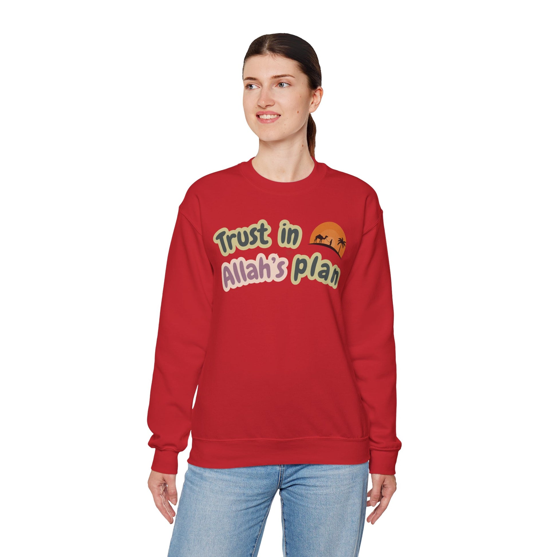 Trust in Allah's Plan Typographic Sweatshirt - Camel Travel in Desert Cozy Soft Cotton Unisex Sweatshirt