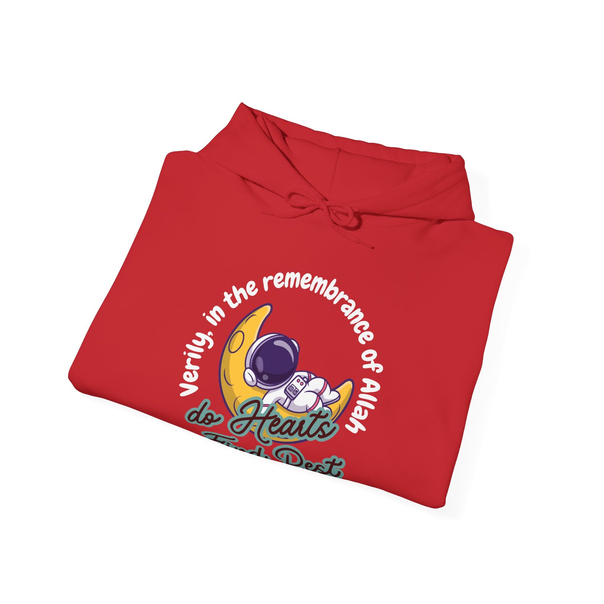 Verily In The Remembrance of Allah Do Hearts Find Rest Hoodie - Astronaut Moon Islamic Graphic Soft Cotton Unisex Hoodie