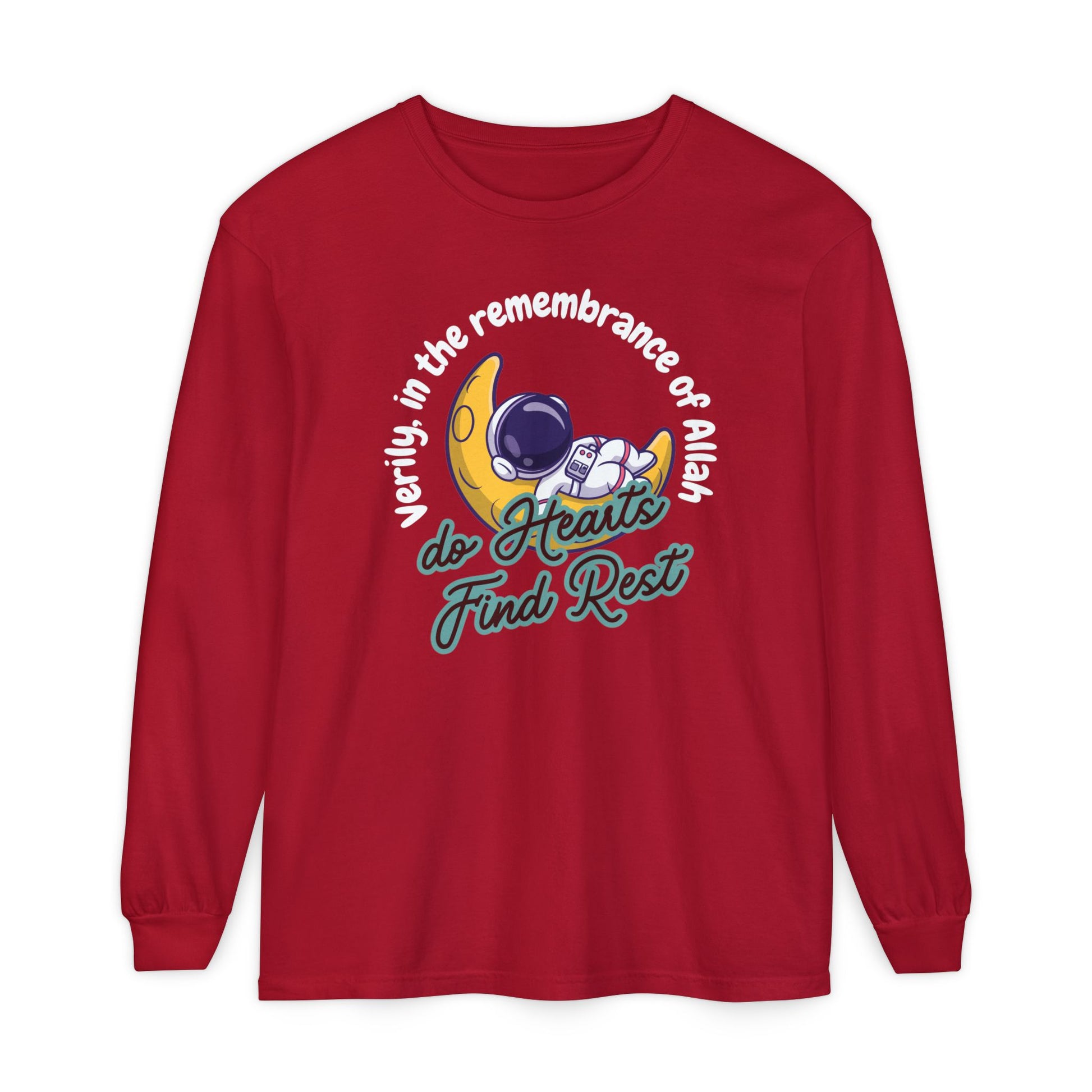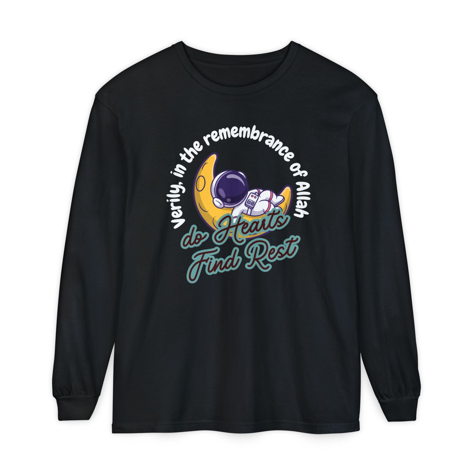 Verily In The Remembrance of Allah Do Hearts Find Rest Long-Sleeve T-Shirt - Astronaut Moon Islamic Graphic Soft Cotton Unisex Long-Sleeve Tee T-Shirt