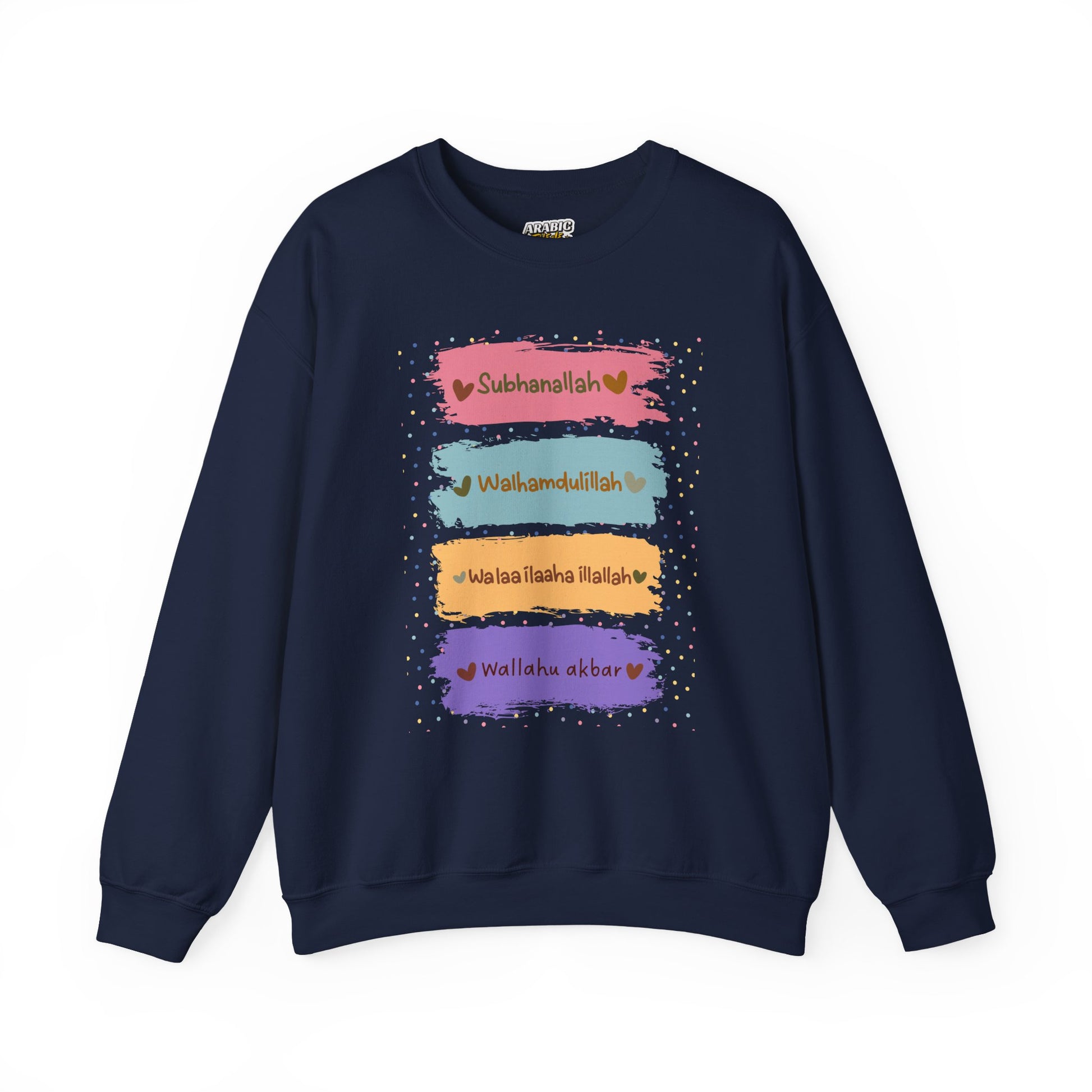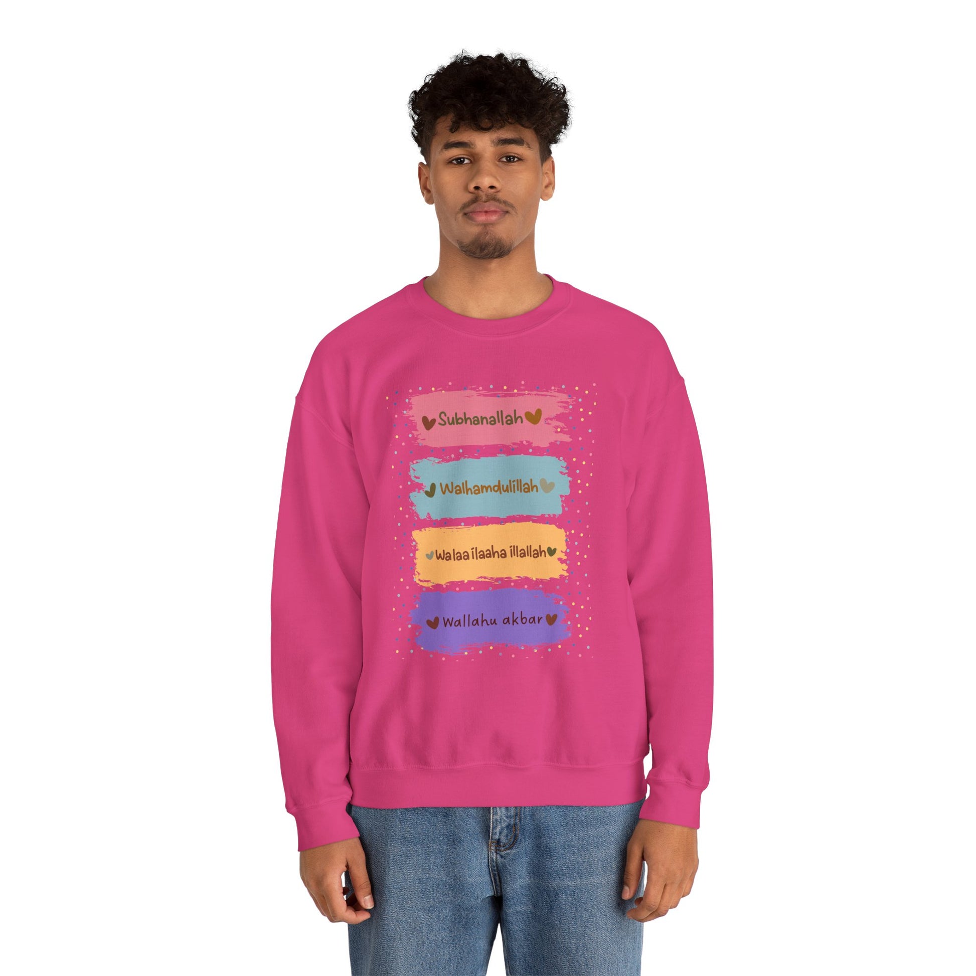 Spread positivity and faith with our Zikr Dhikr Typographic Sweatshirt - Colorful Cozy Soft Cotton Unisex Sweatshirt! A cozy and stylish pullover designed to remind us of the Zikr Dhikr. The Zikr phrase "Subhanallah walhamdulillah wala ilaha illallah wallahu akbar" means "Glory be to Allah, all praise is due to Allah, there is no god but Allah, and Allah is great," a powerful remembrance (dhikr) in Islam, considered more beloved to Allah than worldly things, helping sins fall like leaves, and acting as a "paradise plant" for spiritual reward.