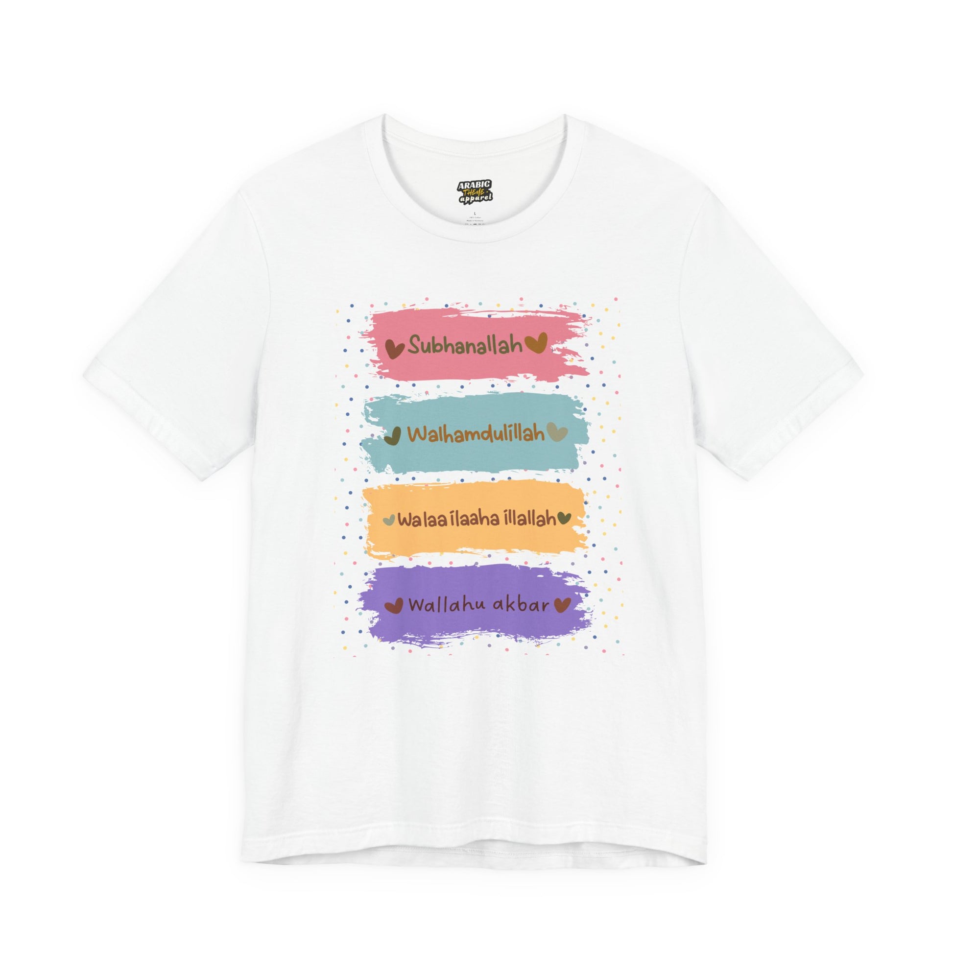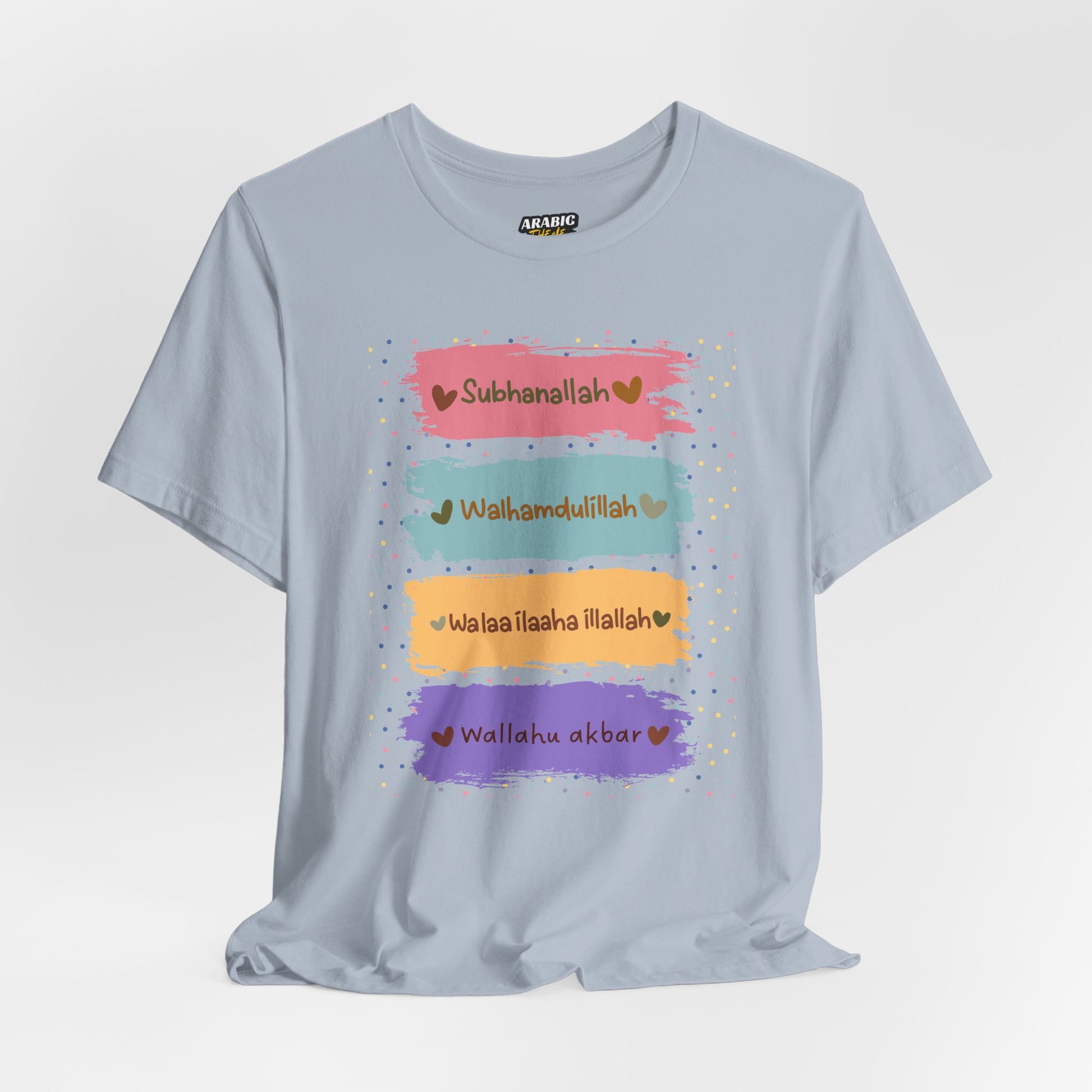Spread positivity and faith with our Zikr Dhikr Typographic Tee T-Shirt - Colorful Cozy Soft Cotton Unisex Tee! A cozy and stylish pullover designed to remind us of the Zikr Dhikr. The Zikr phrase "Subhanallah walhamdulillah wala ilaha illallah wallahu akbar" means "Glory be to Allah, all praise is due to Allah, there is no god but Allah, and Allah is great," a powerful remembrance (dhikr) in Islam, considered more beloved to Allah than worldly things, helping sins fall like leaves, and acting as a "paradise plant" for spiritual reward.